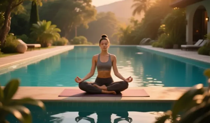Suara gemericik air dan pemandangan biru kolam meningkatkan kualitas relaksasi selama sesi yoga